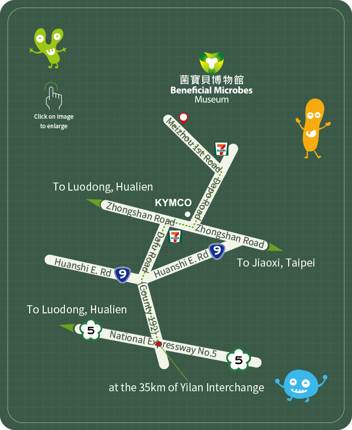 Get off at Yilan Interchange on National Expressway No.5 and turn right at Dafu Road (County 192), go straight to Section 5 of Zhongshan Road and turn right, turn left at the first traffic light and turn left at Dapo Road (the intersection is KYMCO motorcycle shop), and go straight toward Longtan for about 3 minutes Turn left on Meizhou 1st Road (the intersection is 7-11), go straight on Meizhou 1st Road for about 2 minutes and you will find the Beneficial Microbes Museum on the right.