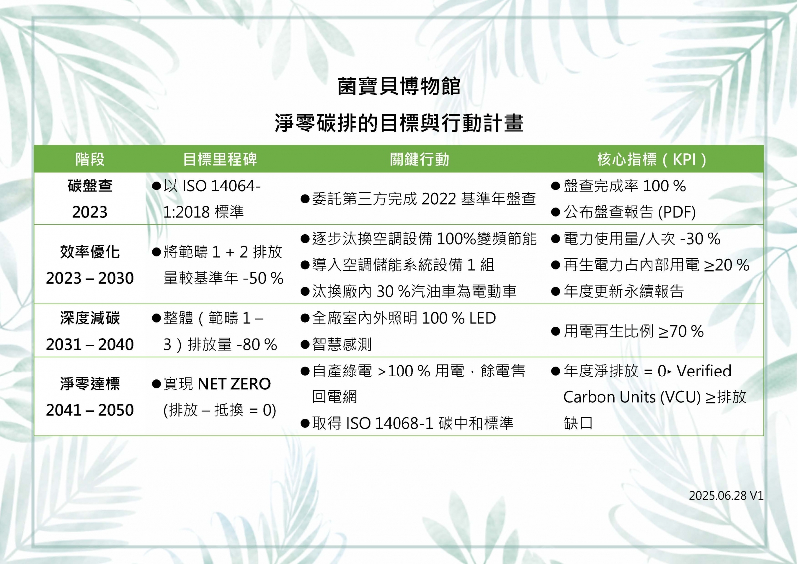 本館淨零碳排的目標與行動計畫,係以同步國家政策2050年為一致目標,邁向淨零未來